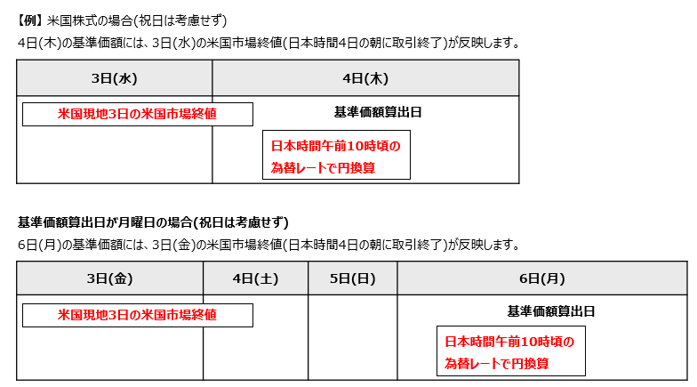 なお、株価は基準価額算出日の午前10時頃(日本時間)の為替レートで円換算します。